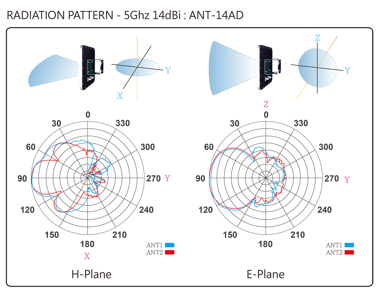 The CERIO ANT-14AD 5GHz 2×2 Outdoor Wide Range Directional 14dBi Panel Antenna supports 5.1 to 5.9 GHz and provides superb performance in Wi-Fi environment. It supports pole and wall mounting installation and constructed with highly UV-resistant PC material (PC-122U) combined with aluminum alloy to achieve a high-sealing IP68 waterproof design. All materials are considered good in water tightness and prevention of rust characteristics.