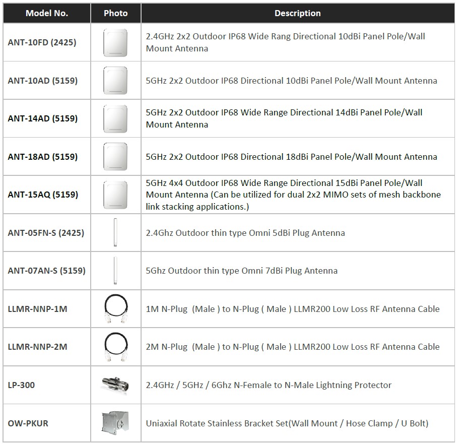 • Packaging includes SUS304 stainless steel single-axis adjustable mounting bracket (OW-PKUR). (Please refer to the detailed specifications of OW-PKUR)