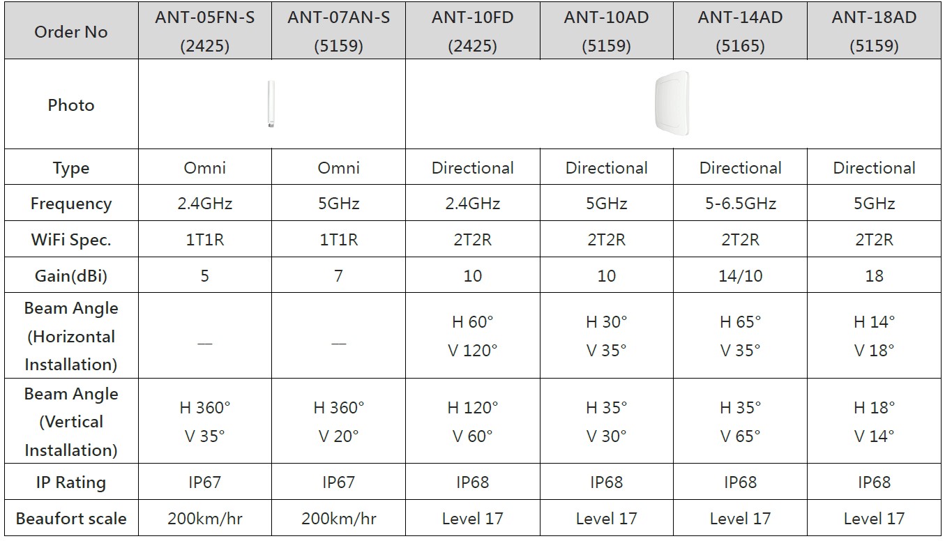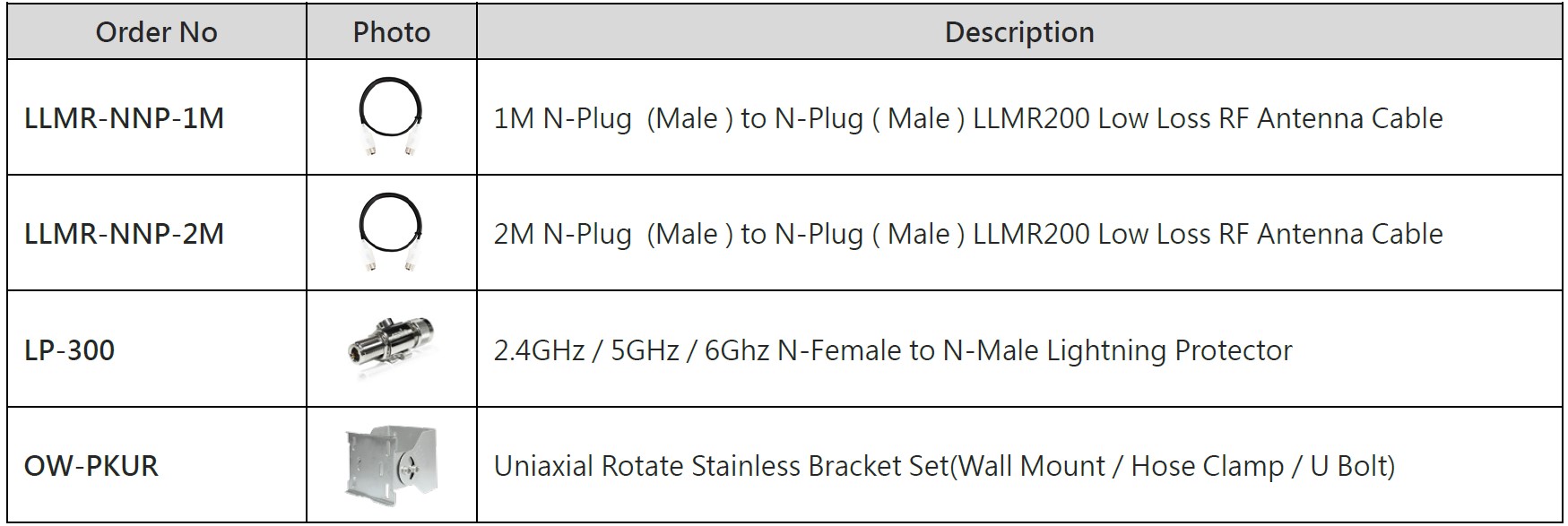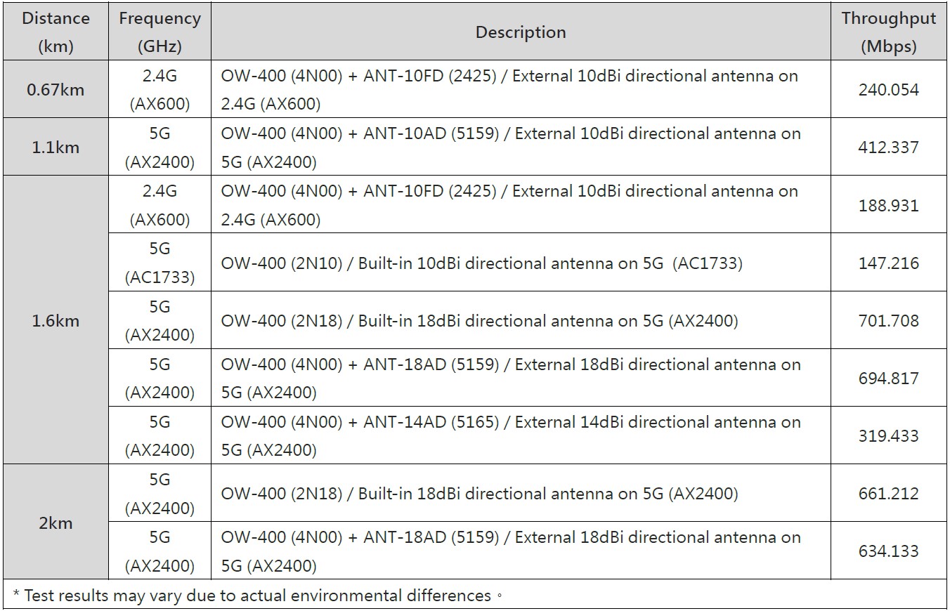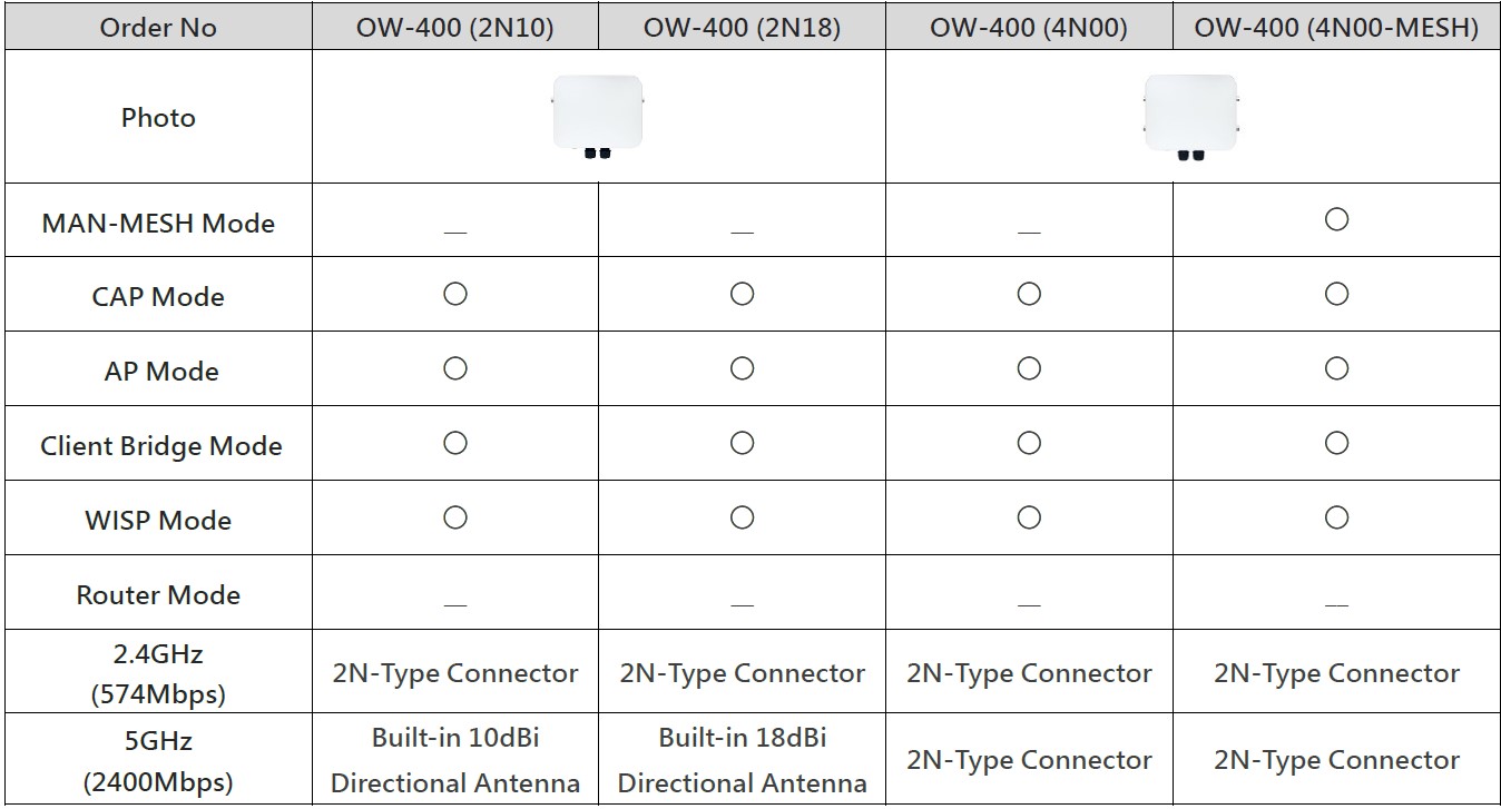 Antenna | OW-400 (2N10): 2.4GHz : 2 N-Type Connectors 5GHz : Built in 2×2 10dBi 5GHz Directional Panel OW-400 (2N18): 2.4GHz : 2 N-Type Connectors 5GHz : Built in 2×2 18dBi 5GHz Directional Panel OW-400 (4N00) / OW-400 (4N00-MESH): 2.4GHz : Support 2 N-Type Connectors 5GHz : Support 2 N-Type Connectors |