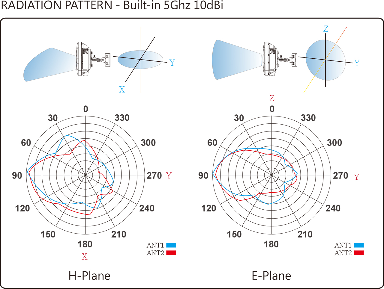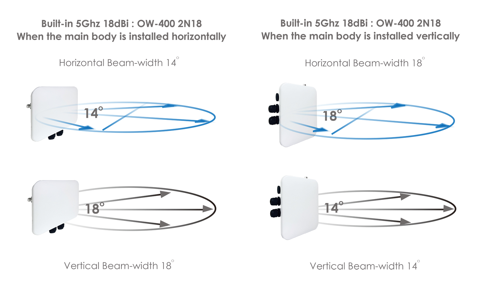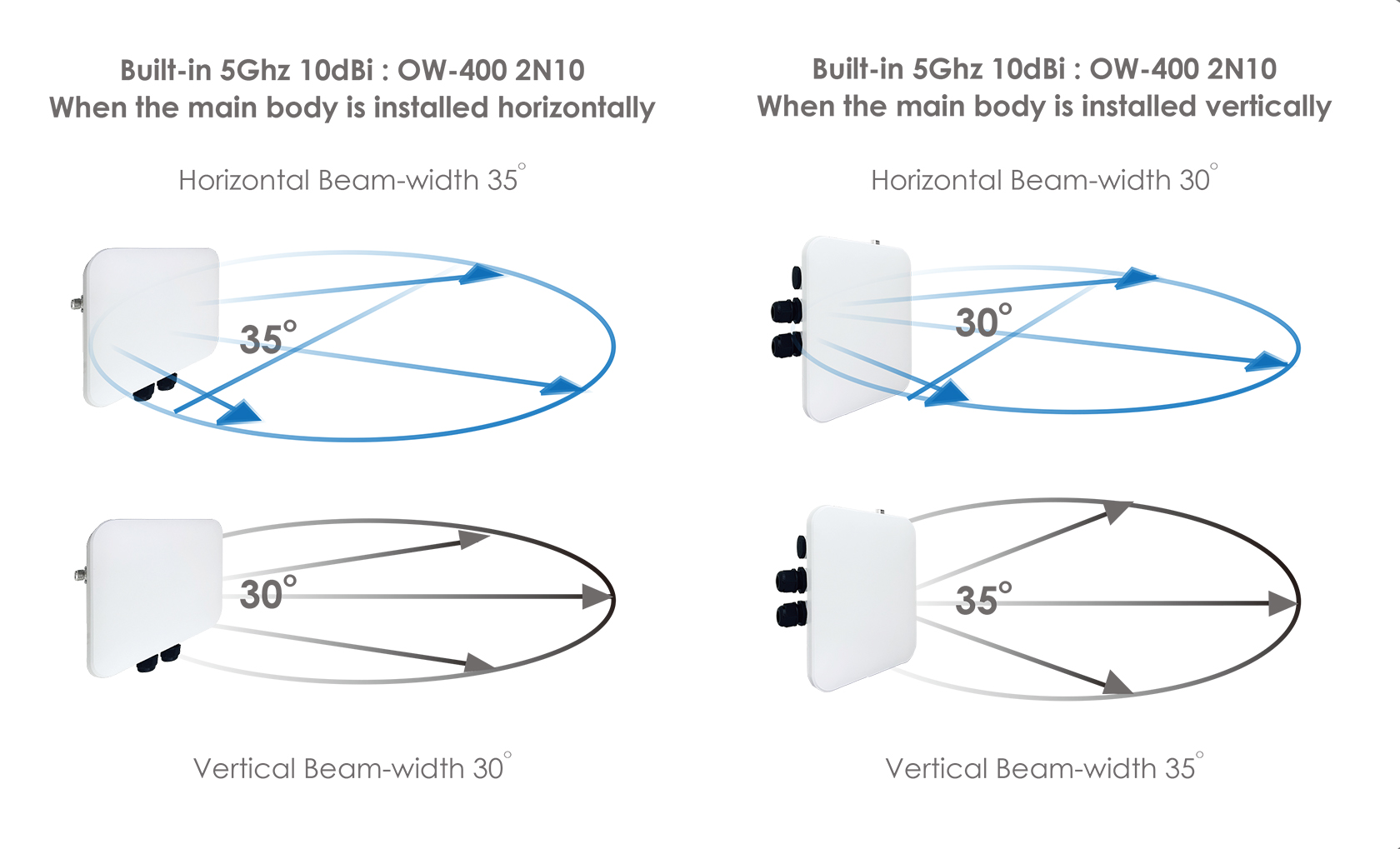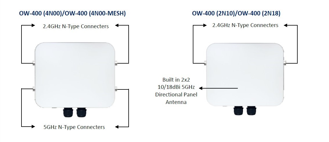 OW-400 (2N18): Built in 2×2 18dBi 5GHz Directional Panel Antenna and OW-400 (2N10): Built in 2×2 10dBi 5GHz Directional Panel Antenna and support 2 external N-Type connectors are assigned to the 2.4GHz band.
